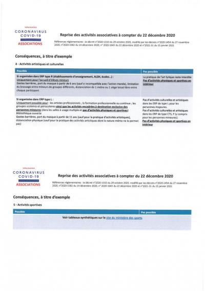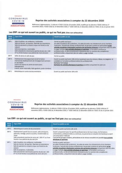 Publié le : 21 janvier 2021 Ci-joint, retrouvez un document relatant les nouvelles directives, mises à jour le 15 janvier 2021, quant à la reprise des activités associatives et l'ouverture des Établissements Recevant du Public (ERP).